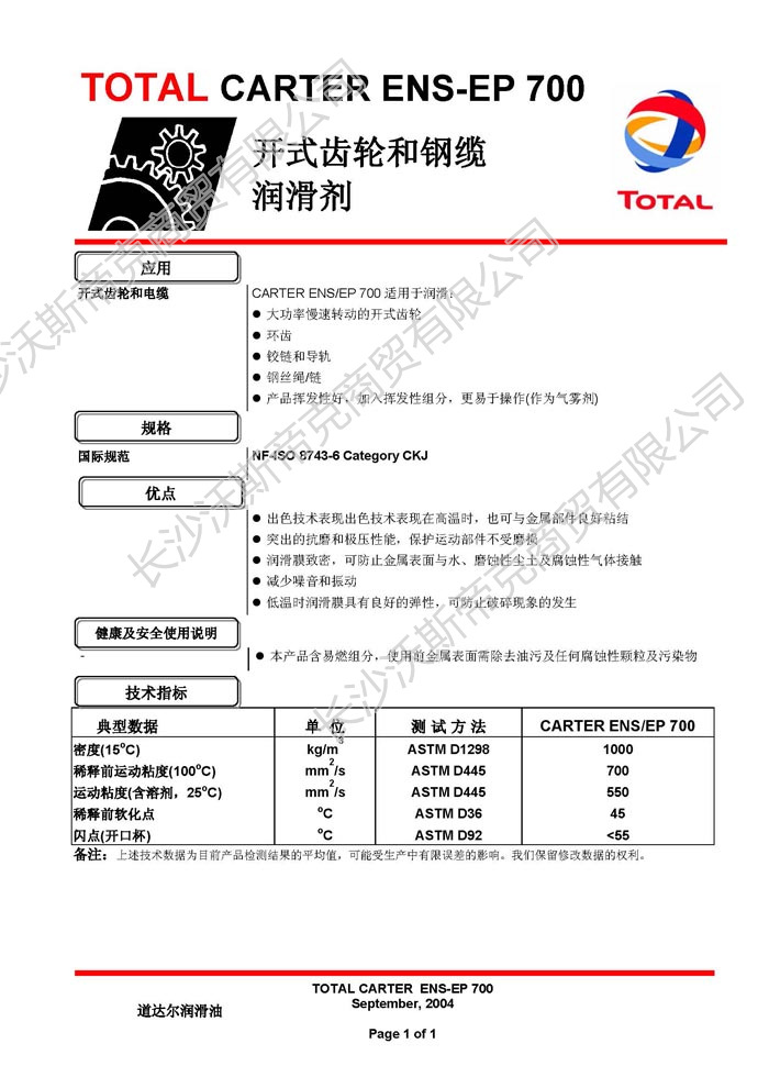 道達爾Carter ENS-EP700開式齒輪和鋼纜潤滑劑 詳細(xì)說明