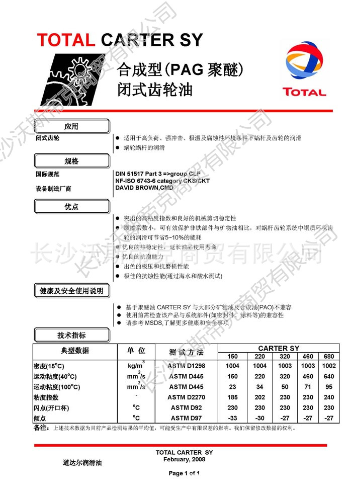 道達(dá)爾Carter SY合成型(PAG聚醚)閉式齒輪油 詳細(xì)說明