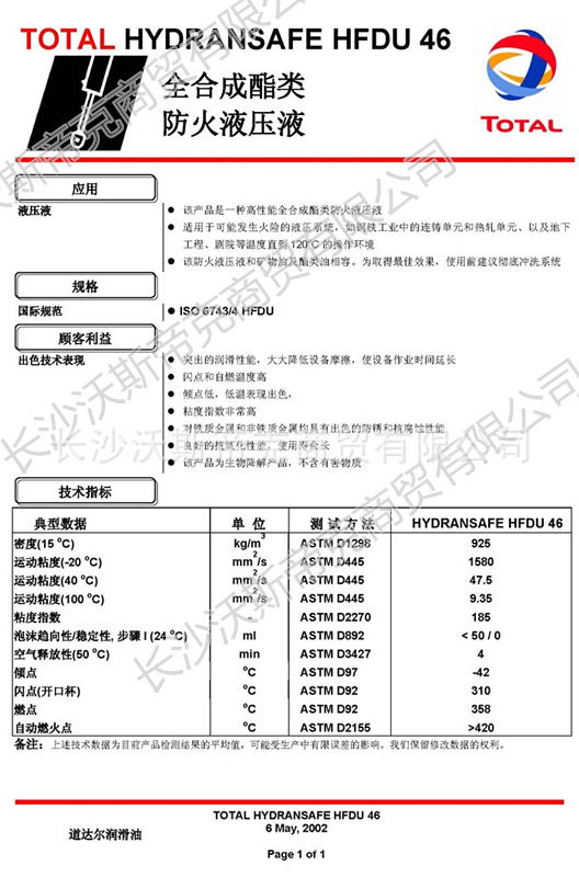 道達爾全合成酯類HFDU46防火液壓油 詳細說明