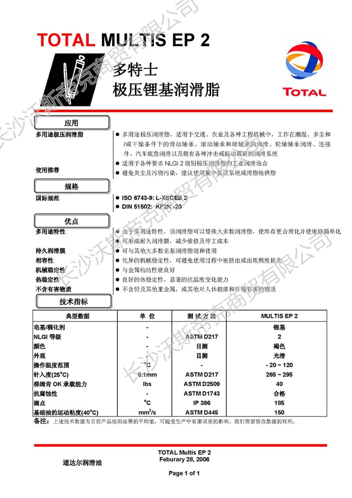 道達爾Multis EP2壓鋰基潤滑脂 詳細說明